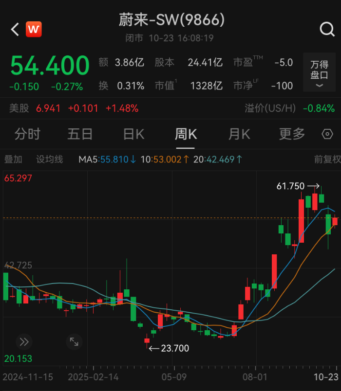 汽车销量的上涨,也带动了蔚来股票的上升。8月1日蔚来港股大涨8.62%,从后蔚来港股一路拉升,截至10月23日收盘,每股报54.4港元,较7月31日收盘涨56.32%,总市值1232亿港元。